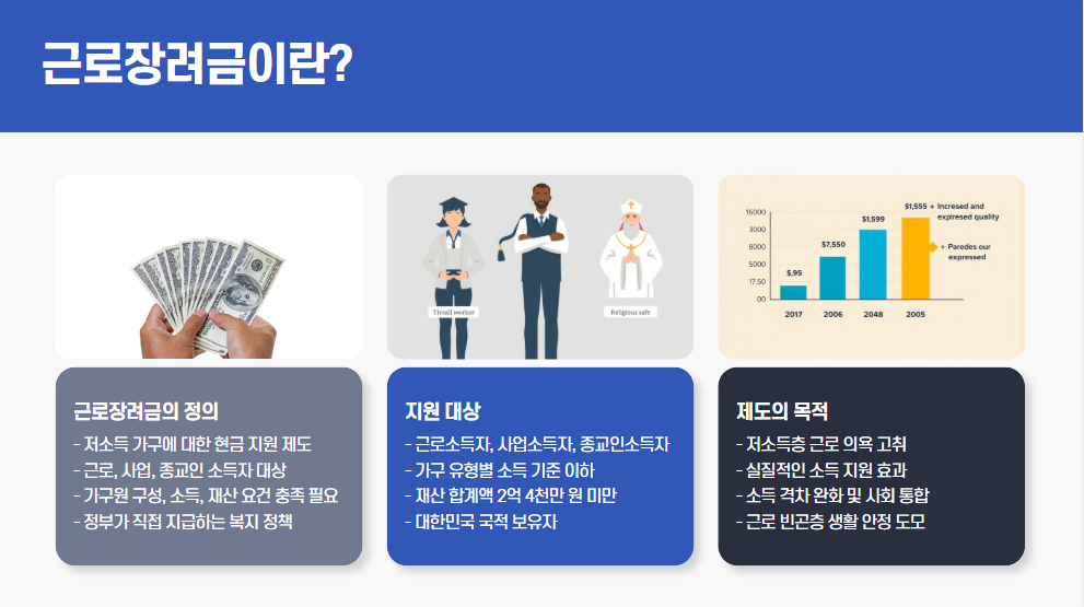 근로장려금은 일정 소득 이하의 근로자, 사업자, 종교인 소득자 가구에 정부가 현금으로 지원하는 제도입니다. 가구원 구성과 근로·사업·종교인 소득, 재산 요건을 모두 충족해야 하며, 실제 근로를 장려하고 저소득층의 생활 안정을 돕기 위해 마련되었습니다.