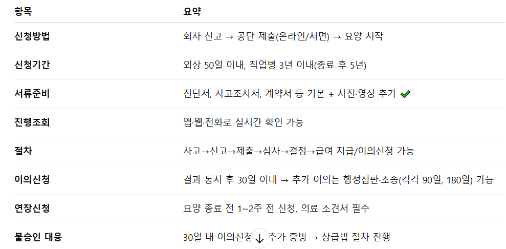 아래는 일반적인 산재 처리 흐름을 단계별로 구성한 표입니다.