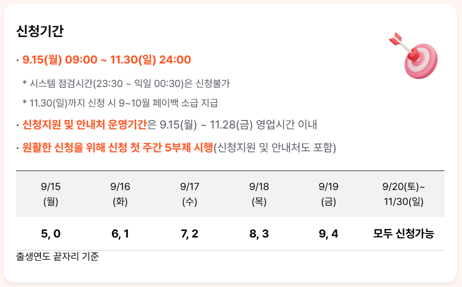 - **첫 주(9월 15~19일)**는 출생연도 끝자리를 기준으로 5부제 운영, 9월 20일부터는 제한 없이 자유 신청 가능
