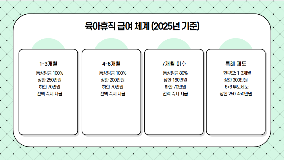 - 첫 6개월: 각각 100% 통상임금 지급, 부모별 상한 250만~450만원 (휴직 맞교환 조합에 따라 상한 차등 적용)