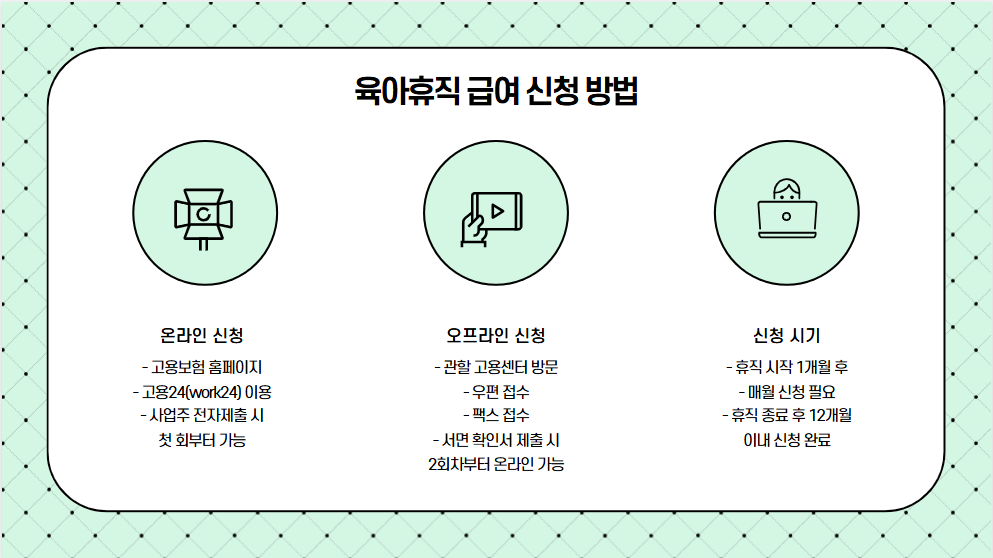 👉 따라서, 육아휴직 시작 전 1~2개월 전에 준비를 시작하고, 휴직 중인 매 달 신청 일정을 놓치지 않도록 계획이 필요합니다.