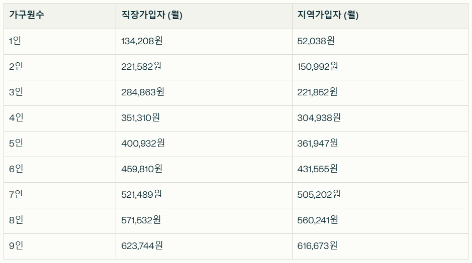 ◇ 기준중위소득 140% 가구별 건강보험료 본인부담 기준(2025년)