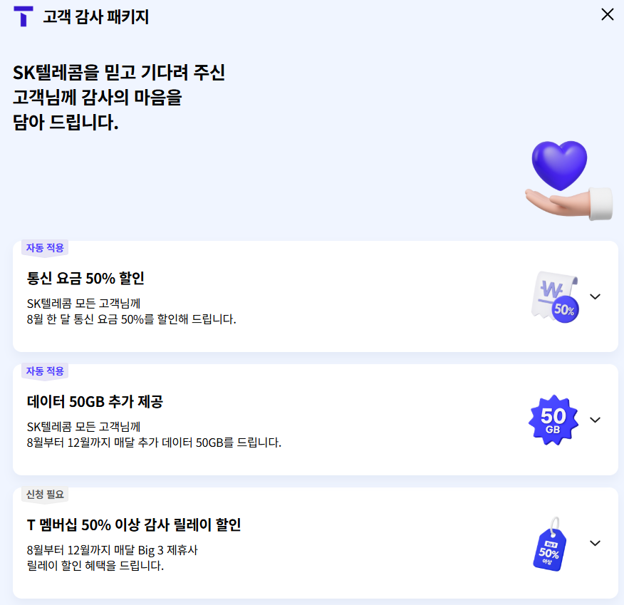 SKT는 위약금 면제 외에도 전 고객을 대상으로 다음과 같은 **‘고객 감사 패키지’**를 제공하기로 했습니다 .